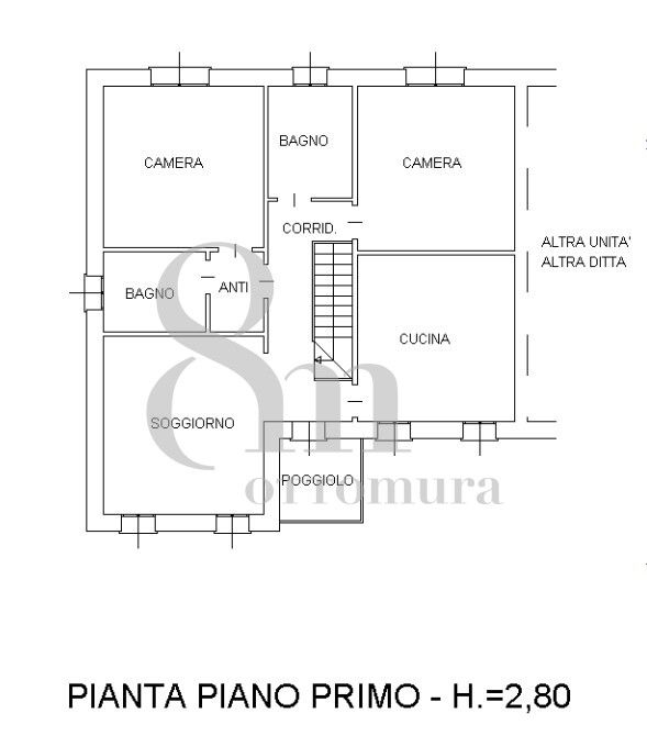 Al primo piano la distribuzione è chiara e immediata. Trovi cucina e soggiorno separati, due camere matrimoniali e due bagni. Una configurazione completa, che permette di vivere gli ambienti in modo ordinato fin da subito e di adattarli nel tempo senza interventi strutturali.