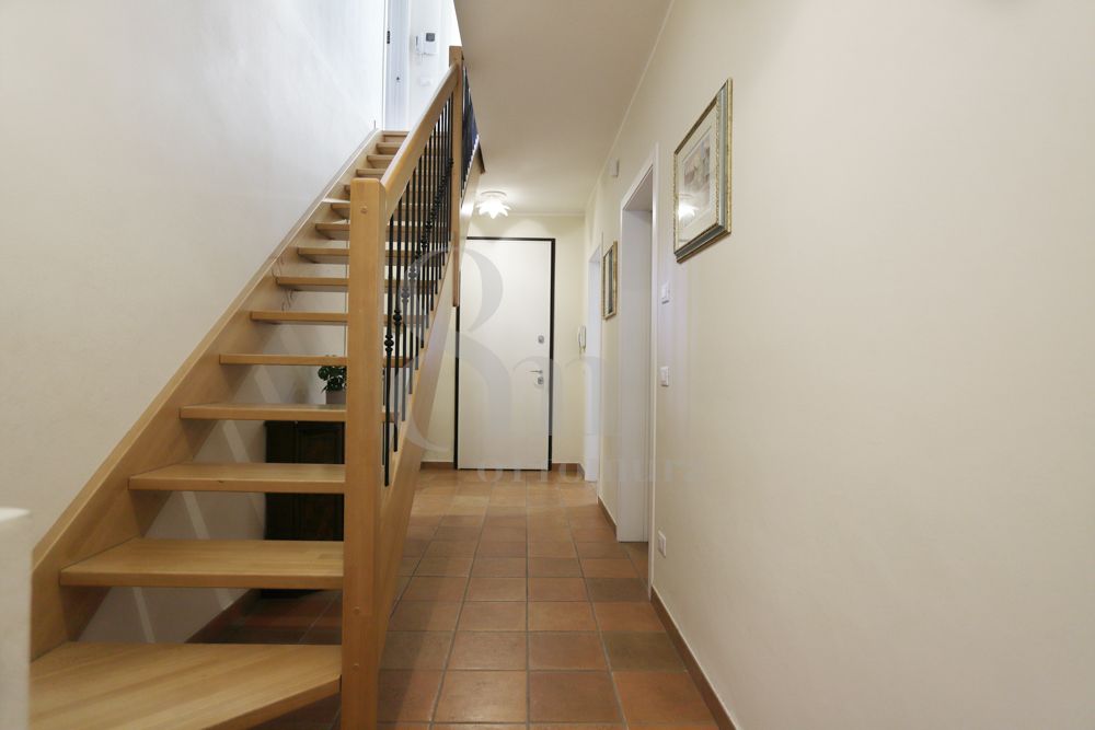 Le finiture seguono una scelta precisa. Cotto d’Este al piano terra, materico e resistente. Legno di rovere al piano superiore, caldo e continuo negli ambienti.