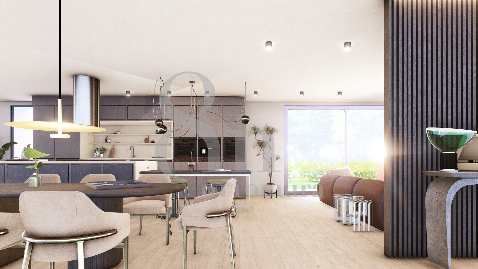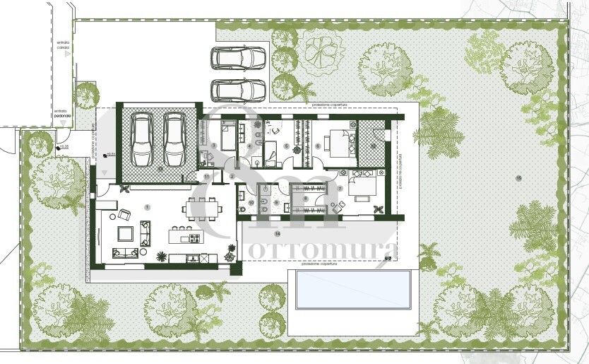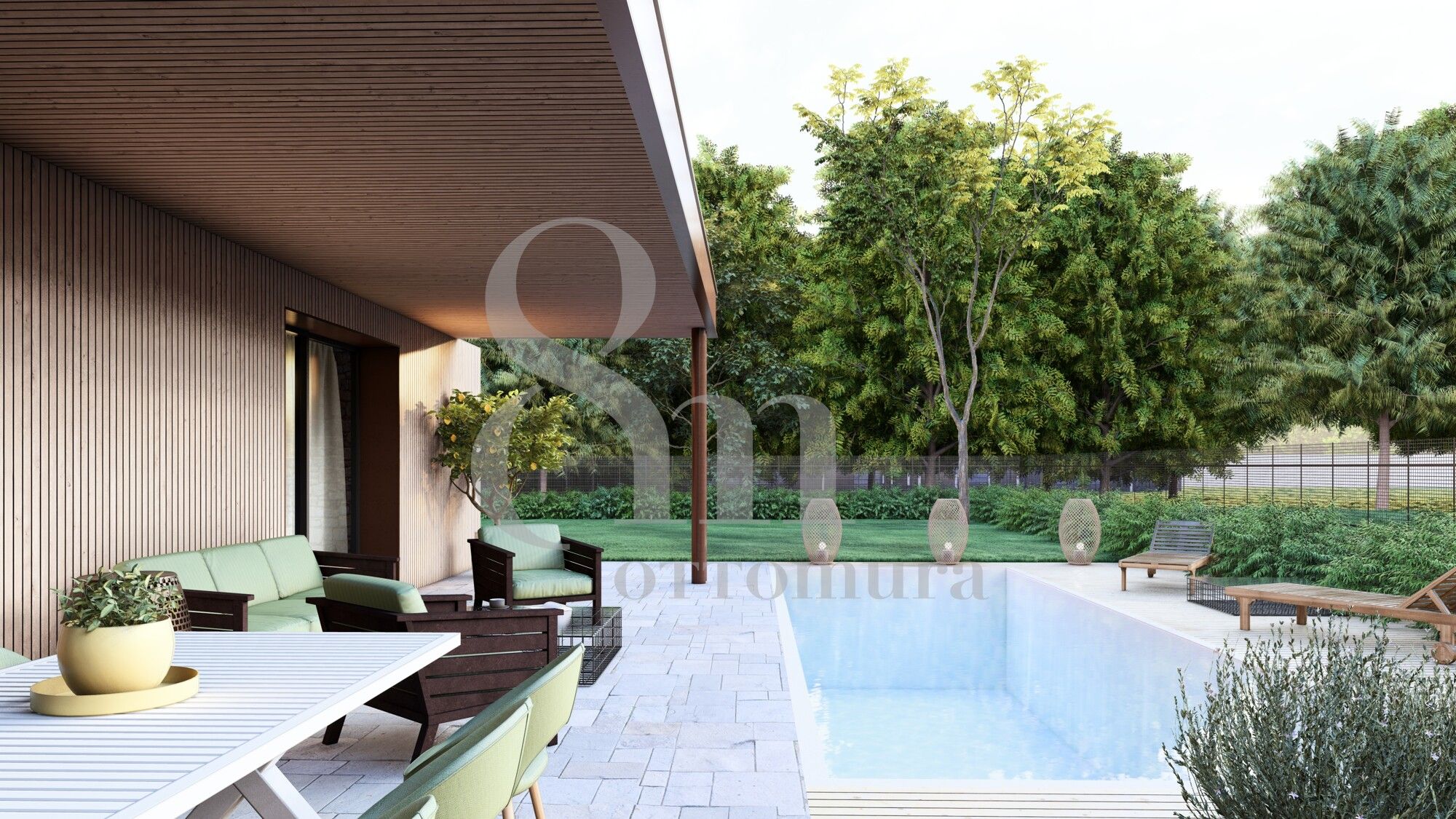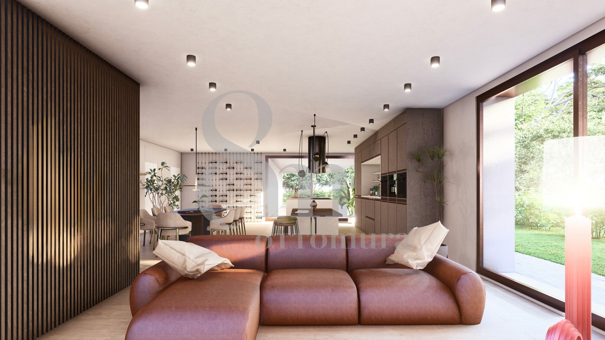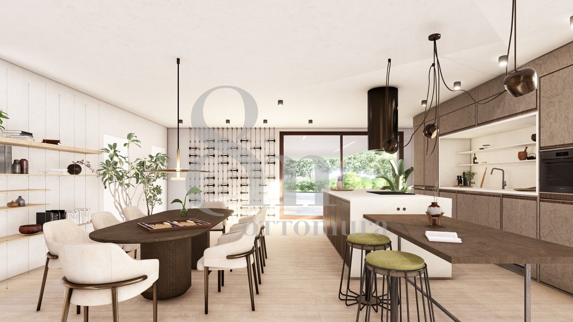 All’esterno trovi circa 720 mq di scoperto privato. Una superficie che consente di integrare giardino, area relax e piscina senza forzature, mantenendo un rapporto diretto con la zona giorno e il portico.